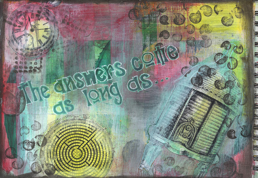 I really like this spread, I love the colours. The gesso base was very textured and it has loads of layers of acrylic paint on it, I think it changed colour about three or four times! I found some great scrap book paper in purple with vintage hand writing on it and also a scrap of paper that came with some ephemera from K & Co. I think there is some Adirondak Colorwash spray where I put a wet stencil in the journal and I also stenciled (through my paper cut stencil) with some gesso to lighten the page, I used a flower stamp and blue ink to stamp over the top and then I drew swirls in dark blue Inktense pencil. I am really pleased with the result.