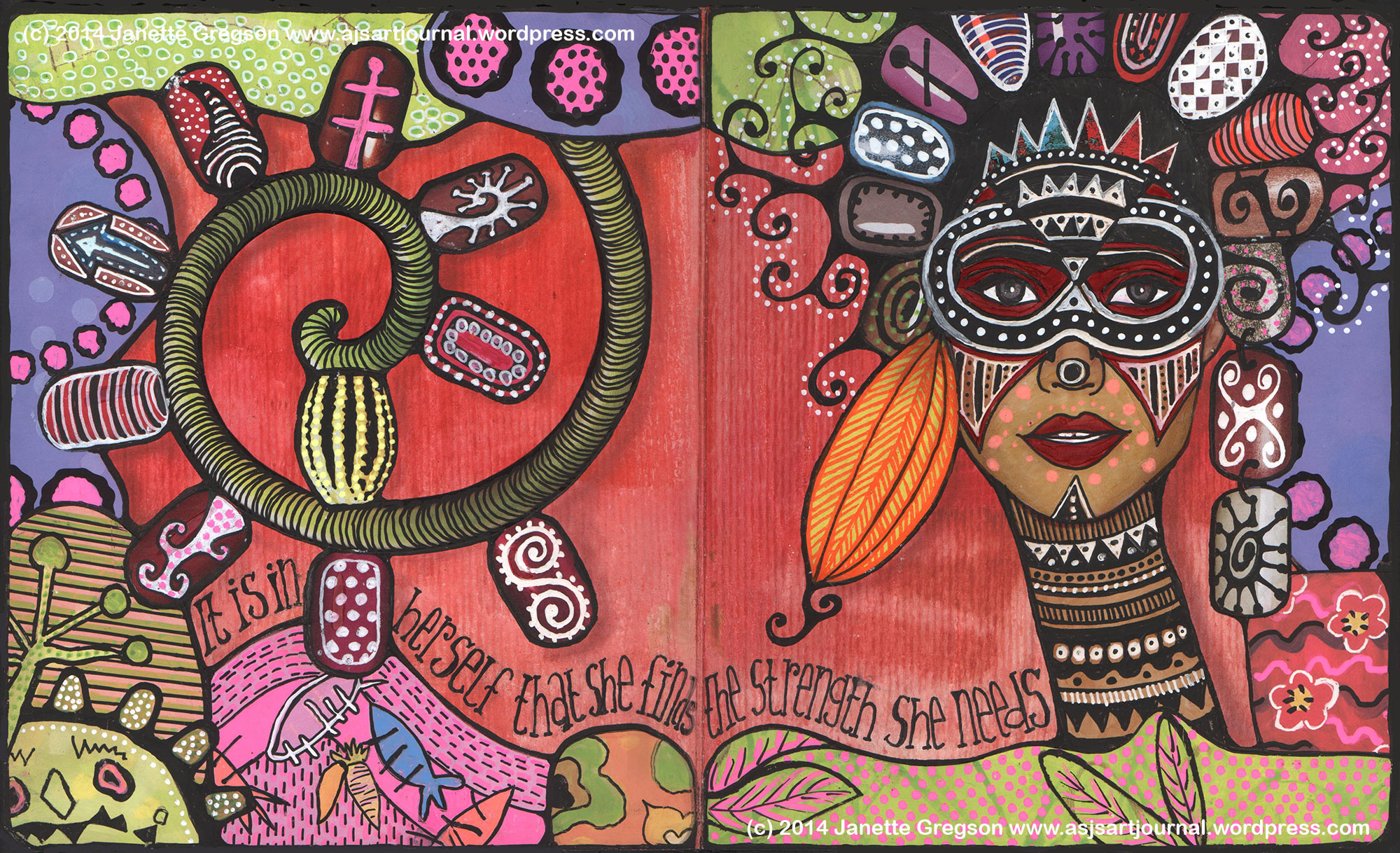 The page above is the last page of the Warrior Women Journal and was completed a few weeks ago. I have also now finished the cover and will share that with you over the next two posts. I like the bright colours and the smiling warrior woman.