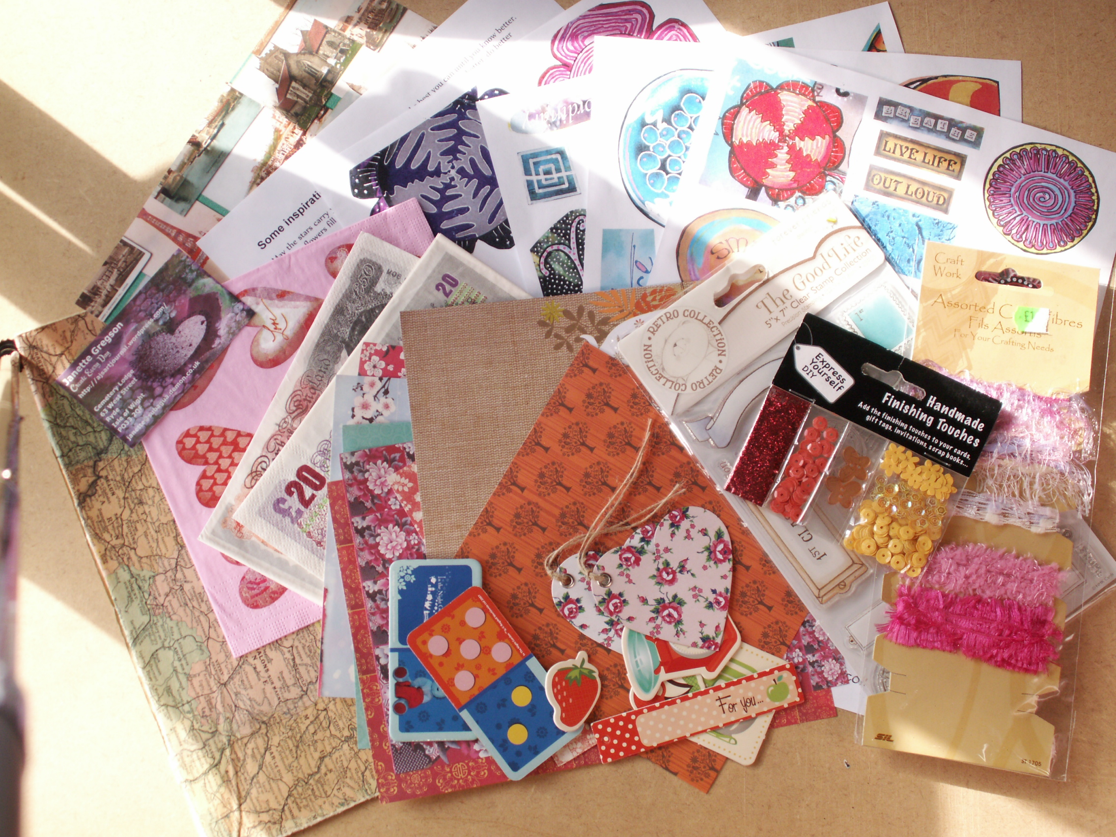 There are collage sheets, papers, some stamps, embellishments, bits of maps and printed papers in each pack.  It looks like there is money too, but the £20 and £50 notes are actually printed on serviettes and are NOT genuine currency 🙂