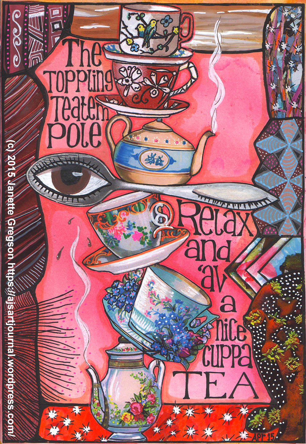 This is another page from my Tikis and Totems journal. I decided to do something completely different and I made a Teatem Pole instead of a Totem Pole. I’m British and we are famous for our tea drinking so I think it’s appropriate that we have a Teatem Pole to honour our heritage 🙂