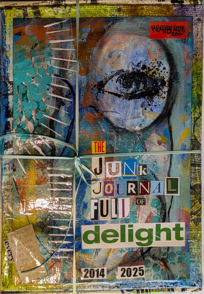 This is the front cover of the box I made for my Junk Journal. The box label indicates it was finished in 2025. I set that date as a personal deadline, but I failed. I did finish the box before the end of the year. However, I still had some pages inside the journal to finish. They took longer than anticipated – don’t they always? The whole thing was finally finished in March 2026.
