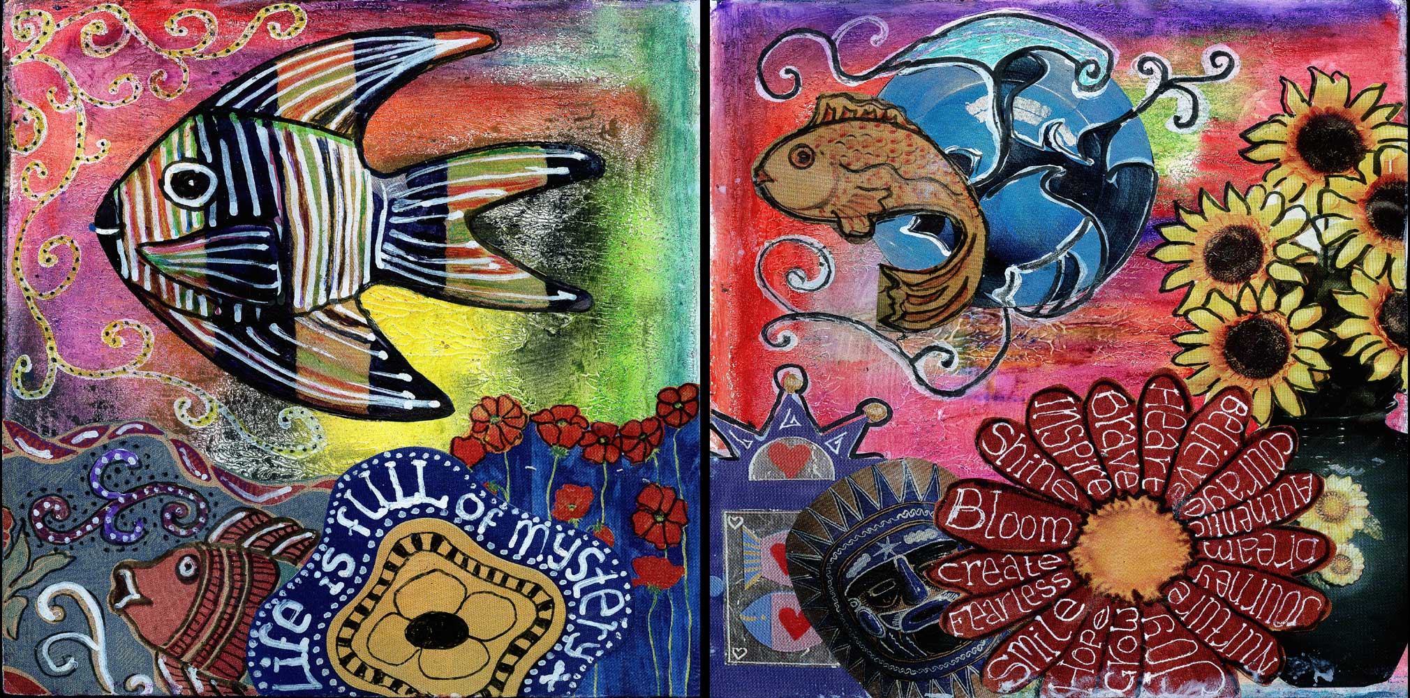 This spread is from my 6×6 journal, the background was gesso’d and then I used some strange oil pastels (I think) to add colour, they were a bit odd and I wasn’t happy with the result. I looked though my box of cuttings from glossy magazines and selected the images which I collaged on top of the background and then I doodled all over it. I like this spread because it’s colourful, it has fish in it and all the words that are important to me right now.