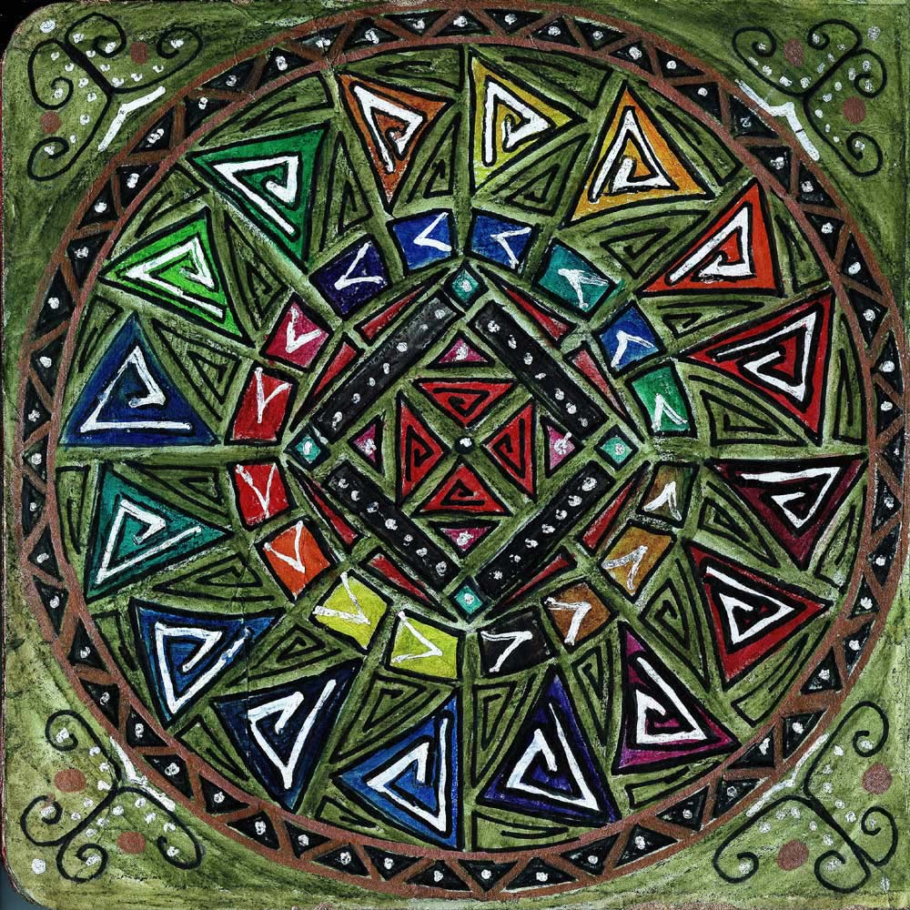 The page above is from my Mandala Book, I’m not sure it really qualifies as a mandala apart from the fact that it’s circular, but I figure if a mandala is a representation of a person’s universe then this is a fair representation of me and mine – my life is colourful, crammed full of stuff and a bit chaotic 🙂